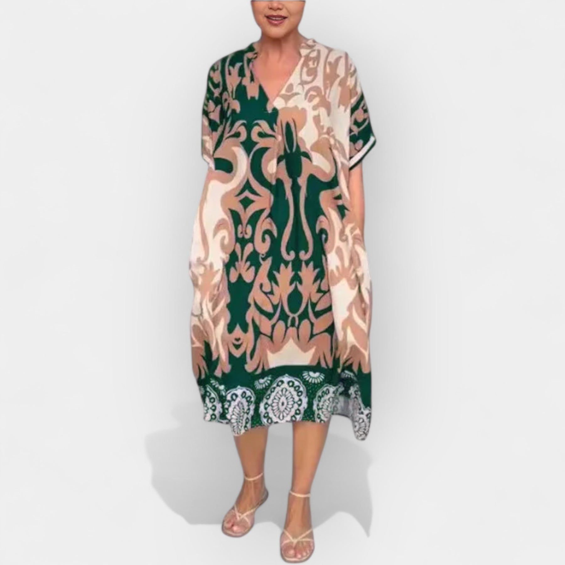 Το φόρεμα αυτό είναι η απόλυτη επιλογή για δροσερές, θηλυκές εμφανίσεις με ελάχιστη προσπάθεια. Η αέρινη γραμμή και η διακριτική V λαιμόκοψη συνδυάζονται με ζωηρό μοτίβο, προσφέροντας ανεπιτήδευτη κομψότητα σε κάθε σας βήμα.