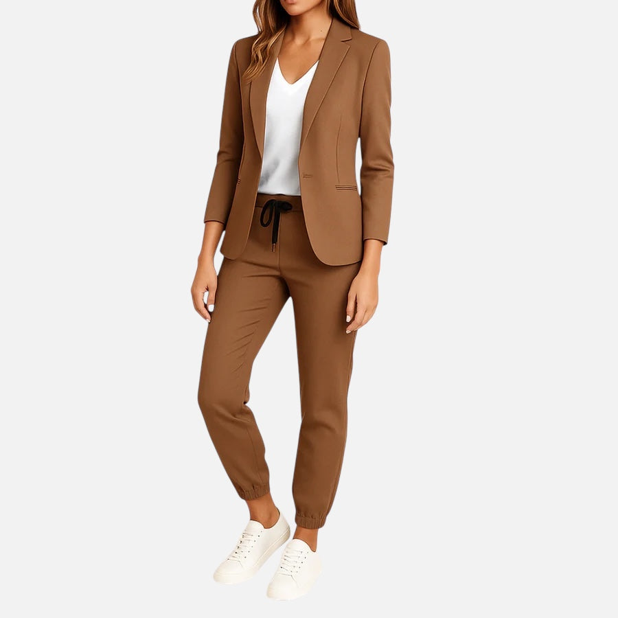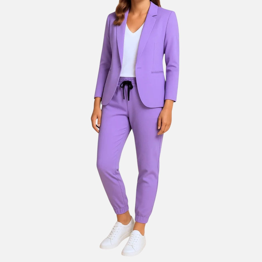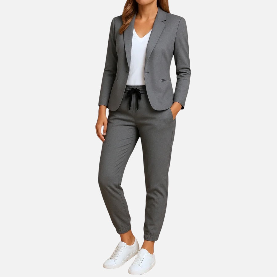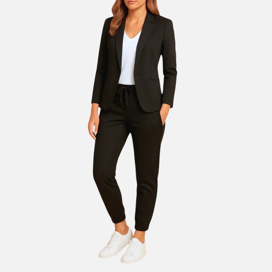 Συνδύασε το σετ με ένα μακρύ παλτό και μποτάκια για ένα κομψό φθινοπωρινό look ή φόρεσε το σακάκι με ένα τζιν και αθλητικά παπούτσια για ένα πιο casual αλλά πάντα κομψό στυλ.